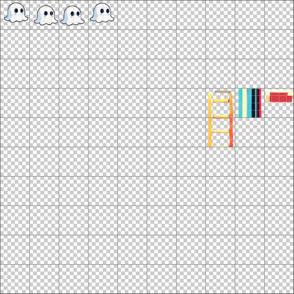 Here is our tentative sheet for Part 1. Yes, there’s a lot of empty space, but this will fill in for later parts. I selected these positions with a bit of strategy; it may be easier to animate our ghost by having four frames in the ghost animation, and I can simply increment a counter to move over the “X” axis in this spite. Likewise, I placed the ladder and structure elements off in a section so I could verify that the ladders and floor structures mostly line up with each other.