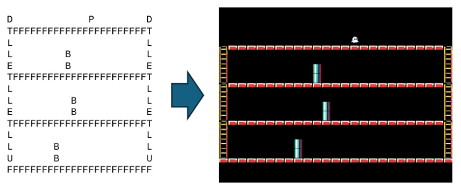 In context of a level draw map: U/D/E allow up, down, or either up or down movement. T/L are drawing cues for ladder structures, but Up/Down/Left/Right movement must also be governed on this. The “F” (Floor) tells us where a floor element can be found. This also allows checks to verify that left or right movement is allowed. “P” tells us where the player spawns, and “B” tells us where a solid block is present.